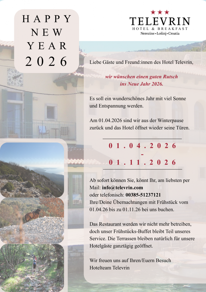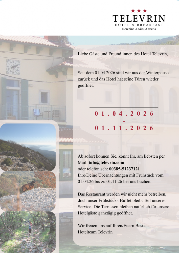Entdecken Sie das Hotel Televrin und erleben Sie die zeitlose Eleganz dieses historischen Gebäudes, kombiniert mit modernem Komfort und herzlicher Gastfreundschaft, während Sie die zauberhafte Inselwelt von Losinj erkunden.